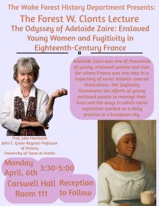 Forest W. Clonts Lecture by Dr. Julie Hardwick, “The Odyssey of Adelaide Zaire: Enslaved Young Women and Fugitivity in Eighteenth-Century France”